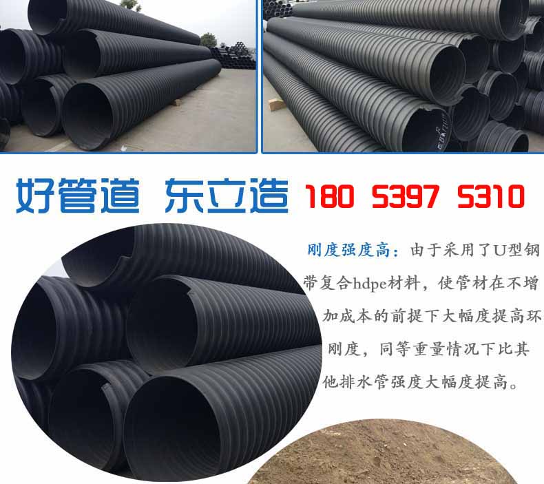 2.大口徑高強(qiáng)度:由于采用了U型鋼帶復(fù)合PE材料,使管材在不增加成本的前提下大幅度提高環(huán)剛度,同等重量情況下比其他塑料排水管強(qiáng)度大幅度提高??山鉀Q重載等一系列問(wèn)題,大口徑管材優(yōu)勢(shì)更加明顯,比水泥管和其它塑料管重量更輕、強(qiáng)度更高。